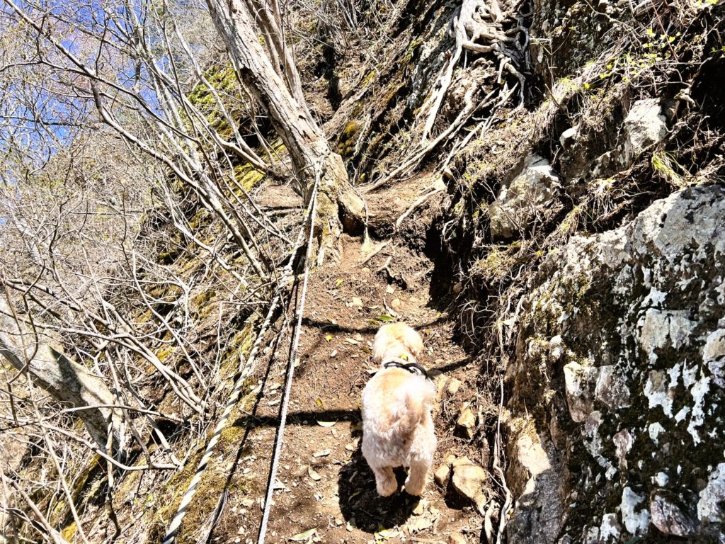 周りの眺望が望めるようになってくると、勾配も厳しくなり、ロープ付きの登山道が始まります。
