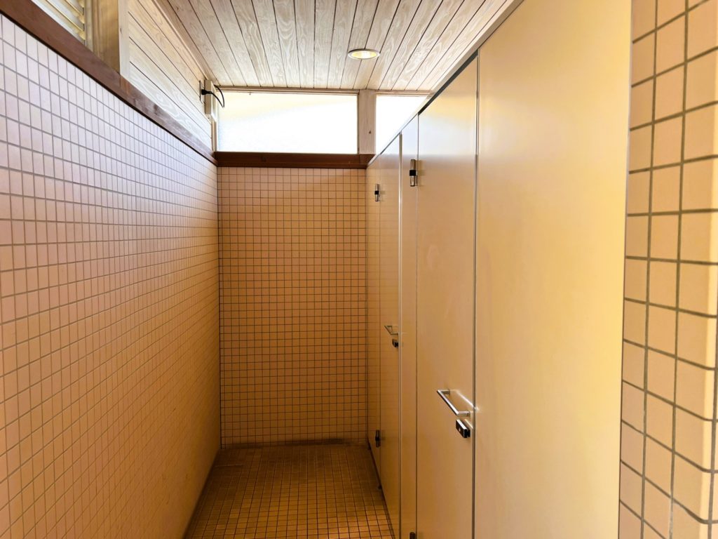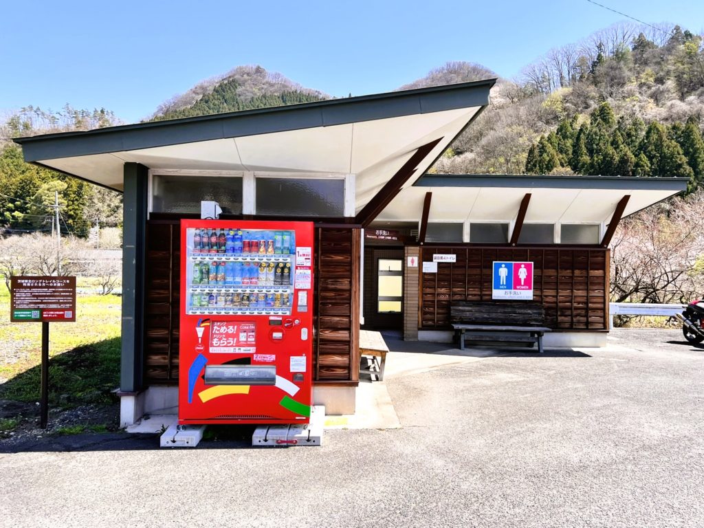 キレイな建物のトイレがあり、自動販売機も設置されています。
