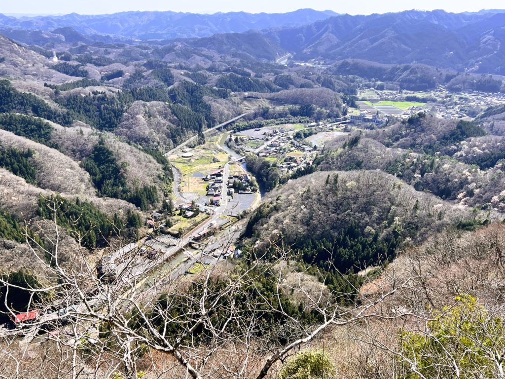 久慈川に沿った「大子町」の街並みがミニチュアのように広がる眺望。