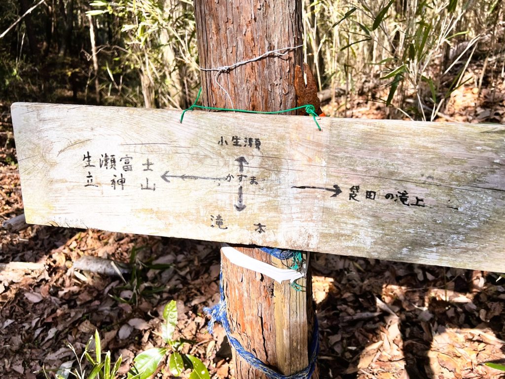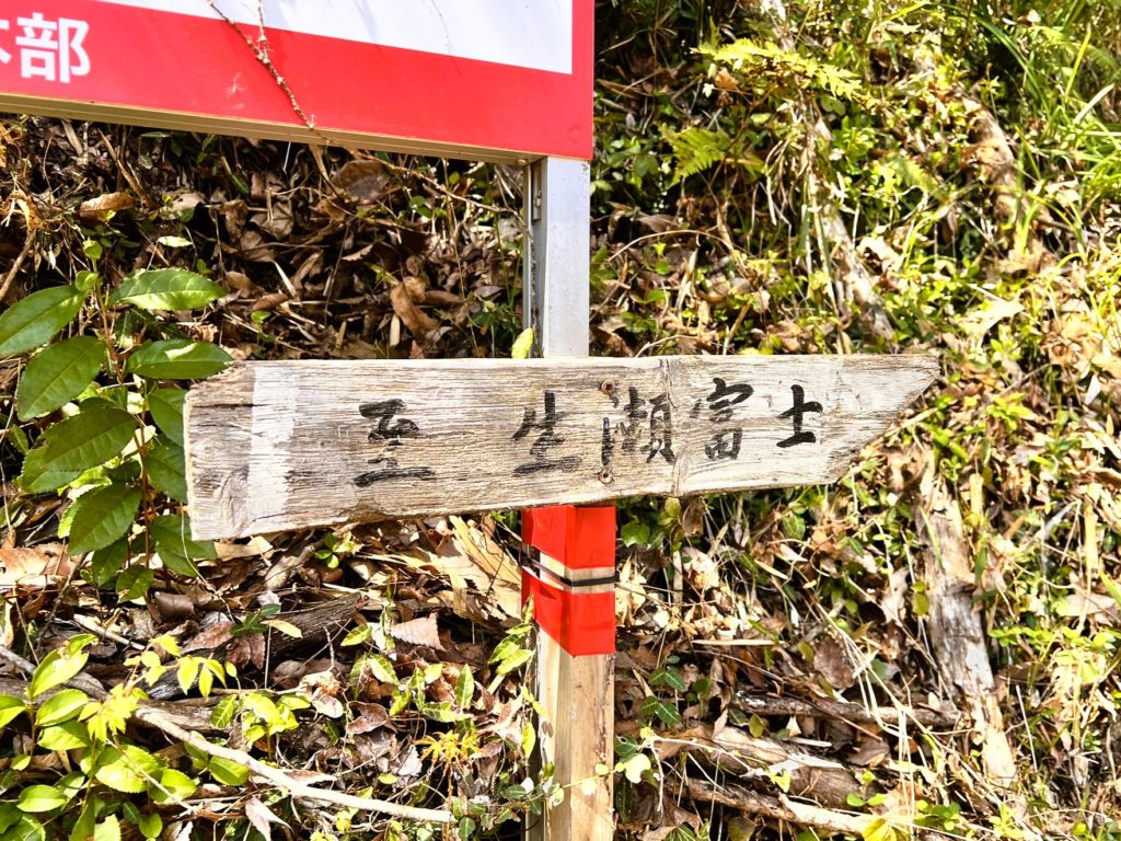 「山火事注意」の看板の下に「生瀬富士」への案内板があります。