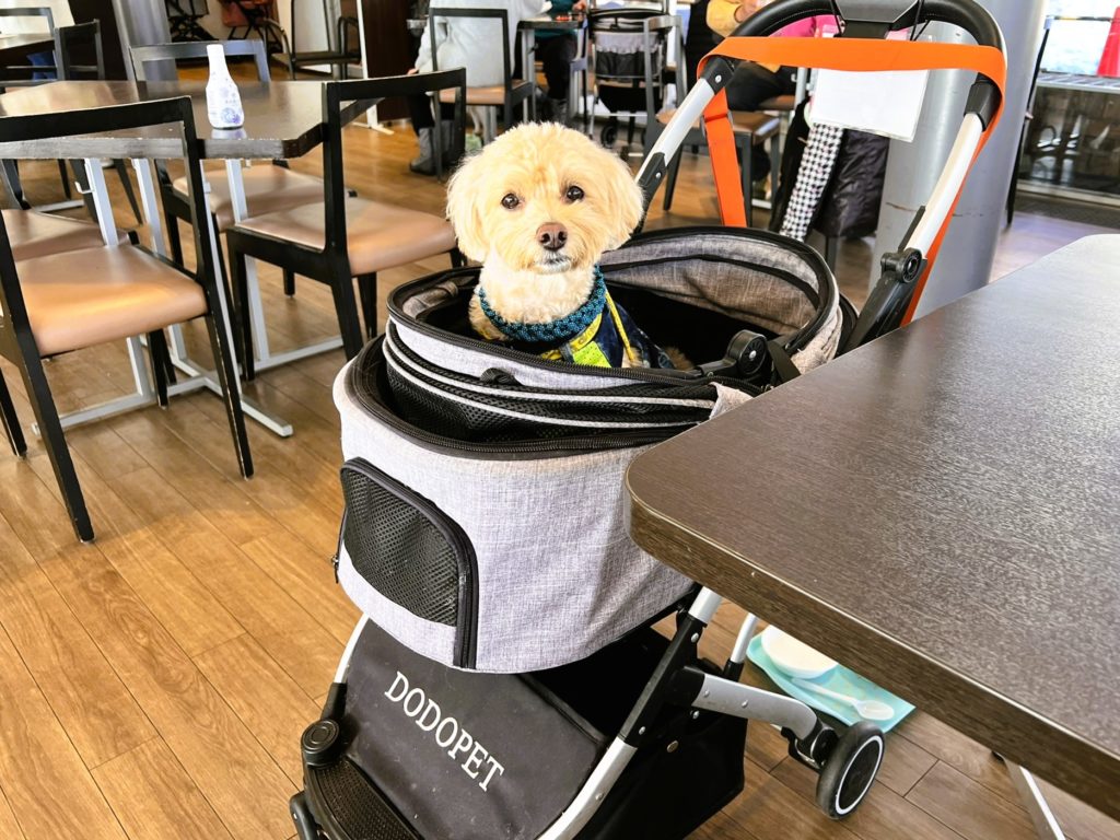 ワンちゃんは、リード付きで床に座るか、カートの利用が義務付けられています。