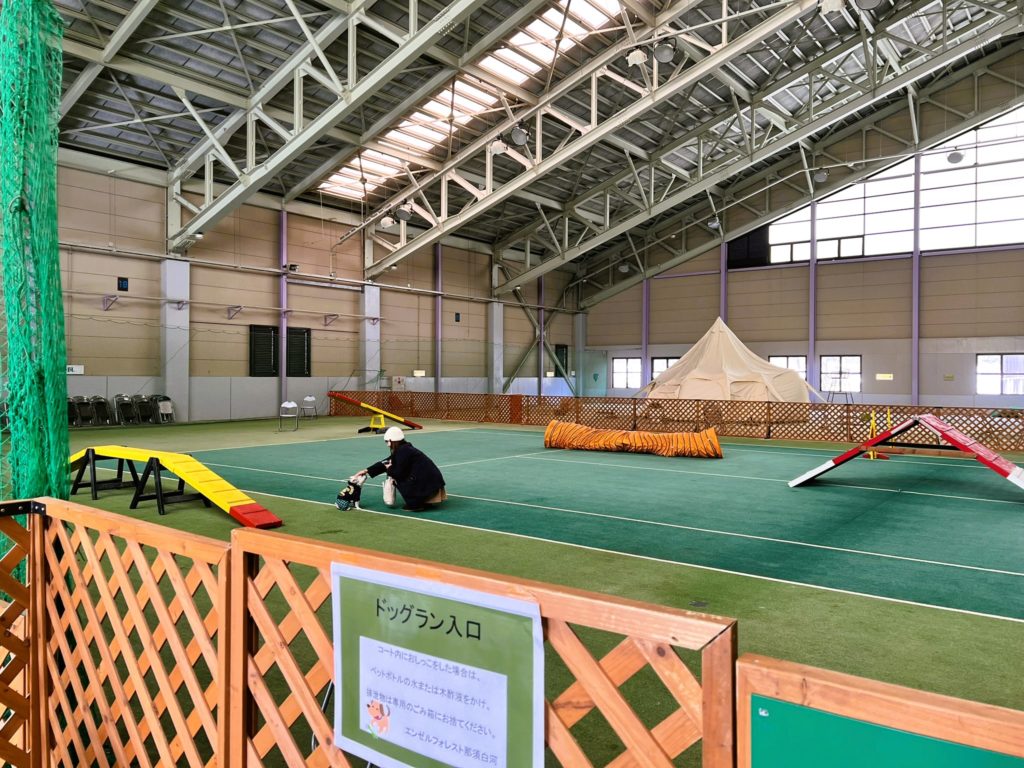 室内は区切られており、約半分がドッグランになっていて、アジリティ設備がひと通り設置されています。