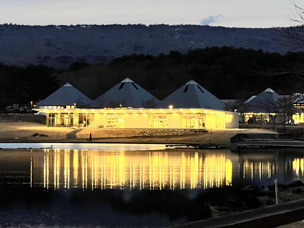 湖に輝くリフレクションが美しい「スノーピーク」の建物。