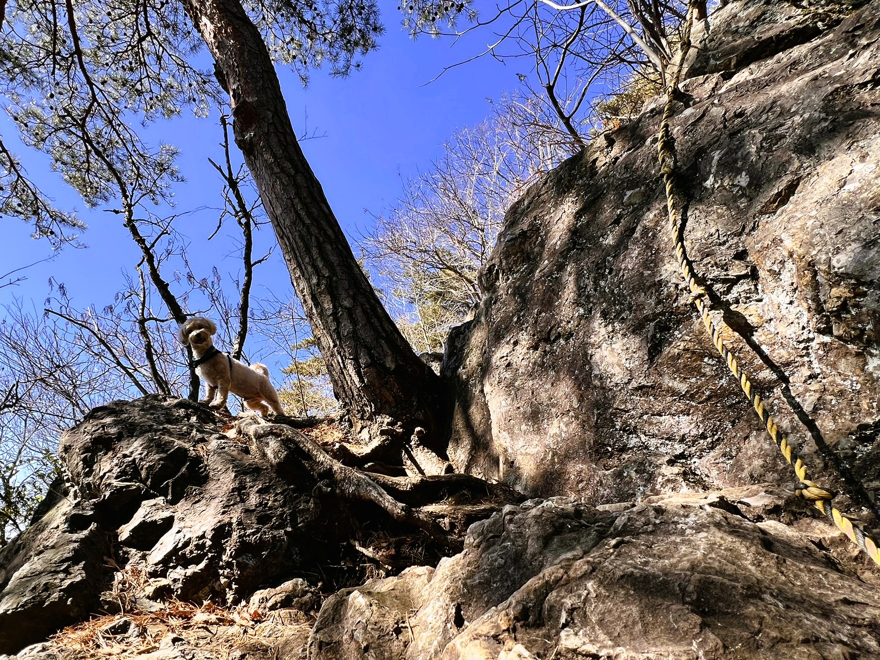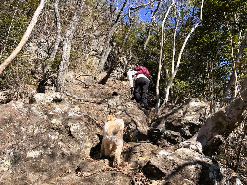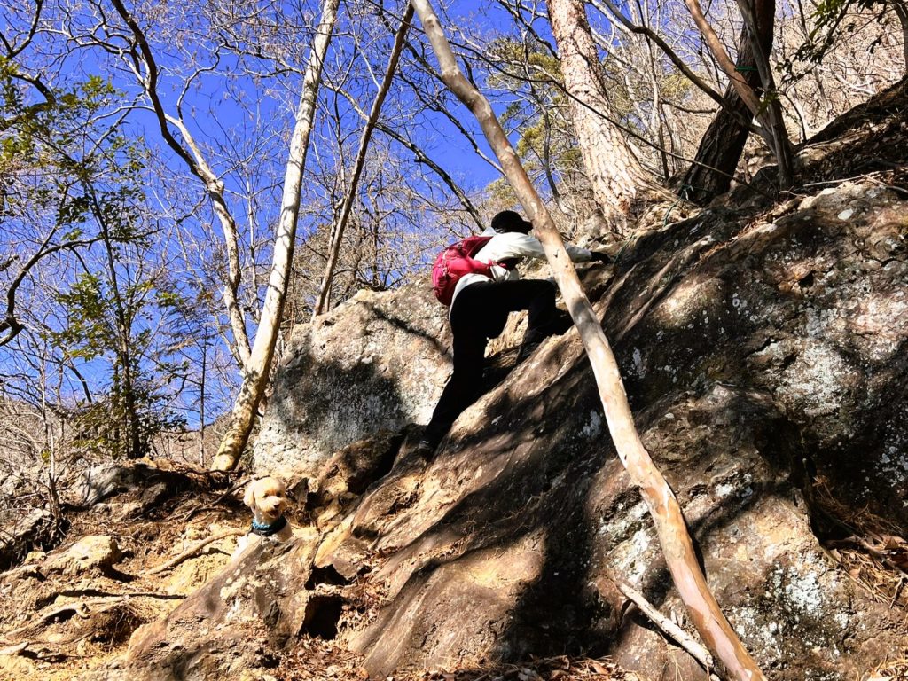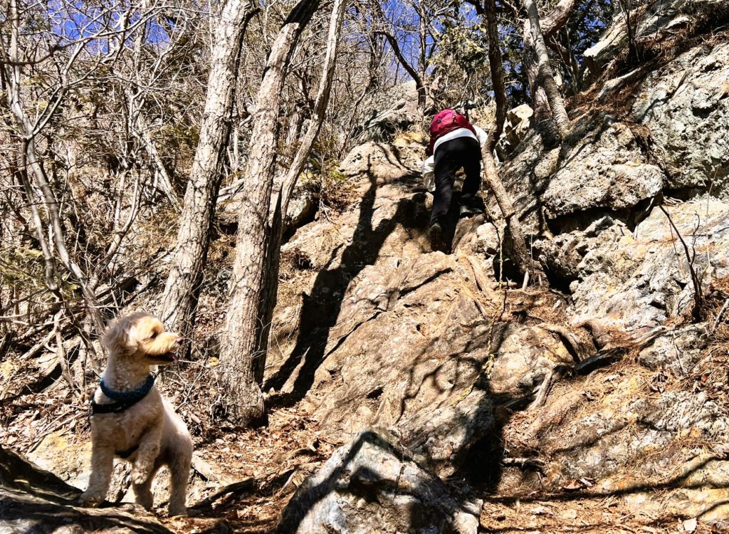 ほぼ垂直の岩壁をよじ登り、人間もワンコも必死に上を目指します。