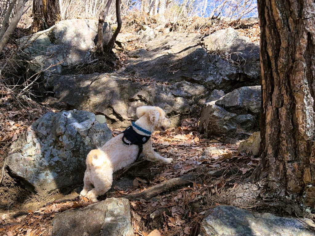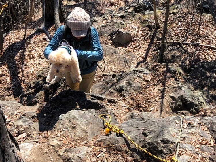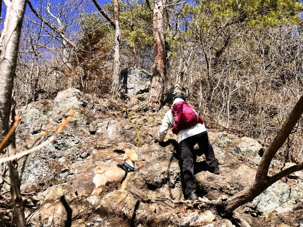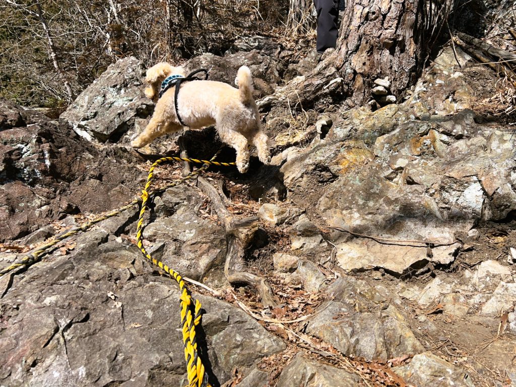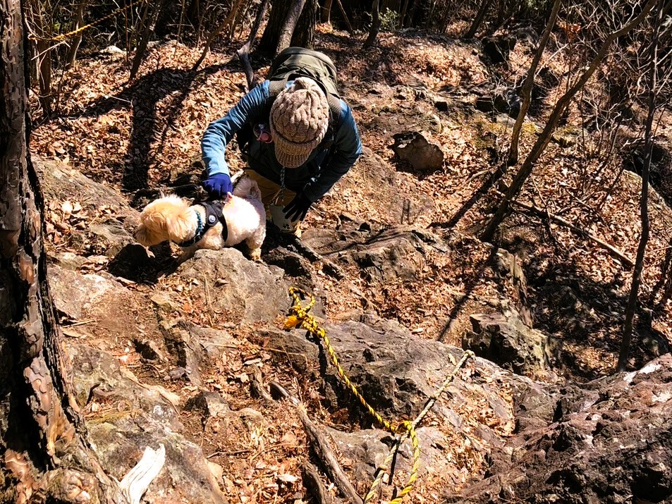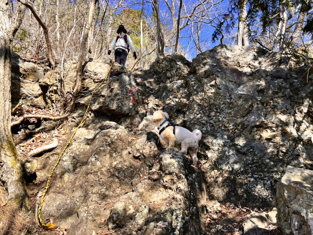 ほぼ垂直の岩壁をよじ登り、人間もワンコも必死に上を目指します。