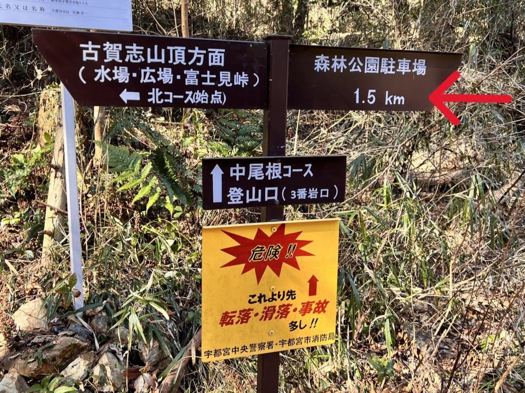 「森林公園駐車場」まで残り1.5kmの分岐点。