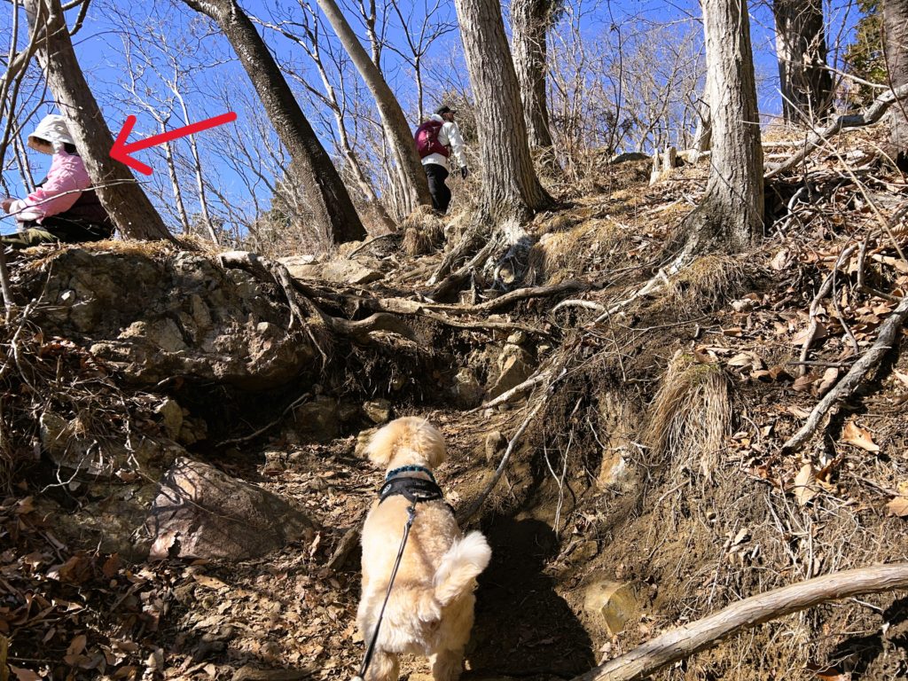 岩場が山道に変わってくると、休憩している人の姿がありました。