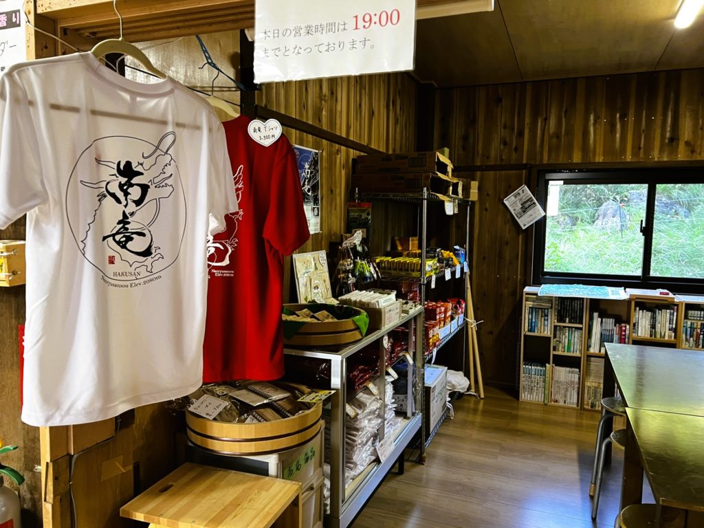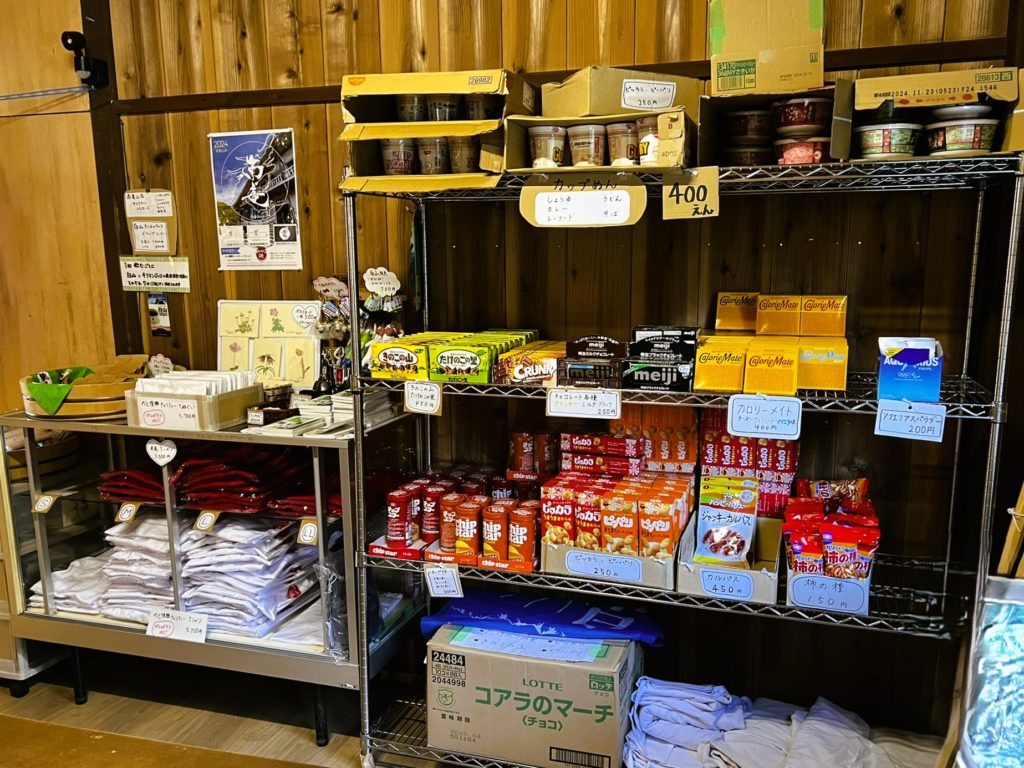 Tシャツ・手ぬぐい、カップラーメンやお菓子類などの販売があります。