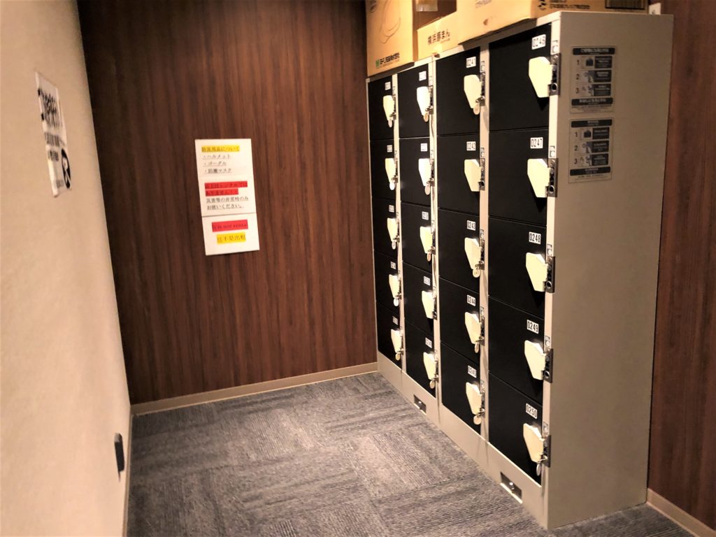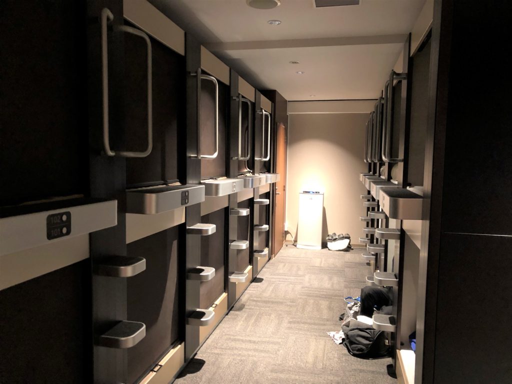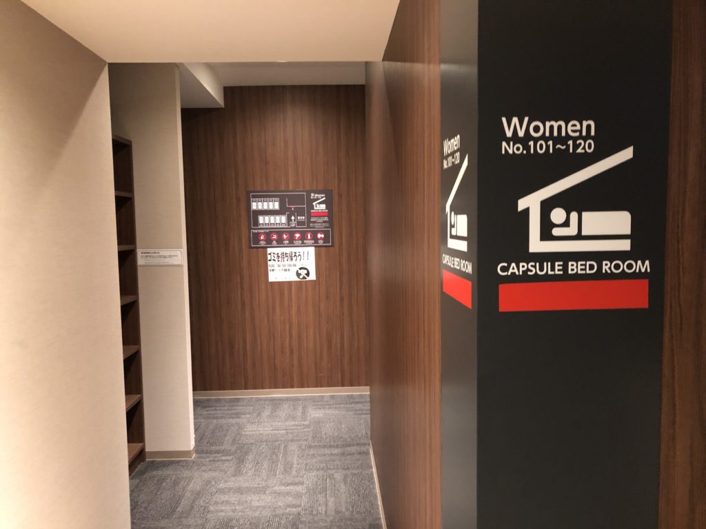 部屋のは男女別々になっています。各カプセルルームはシェードが閉められるようになっているので、プライバシーが守られゆっくり着替えもできます。